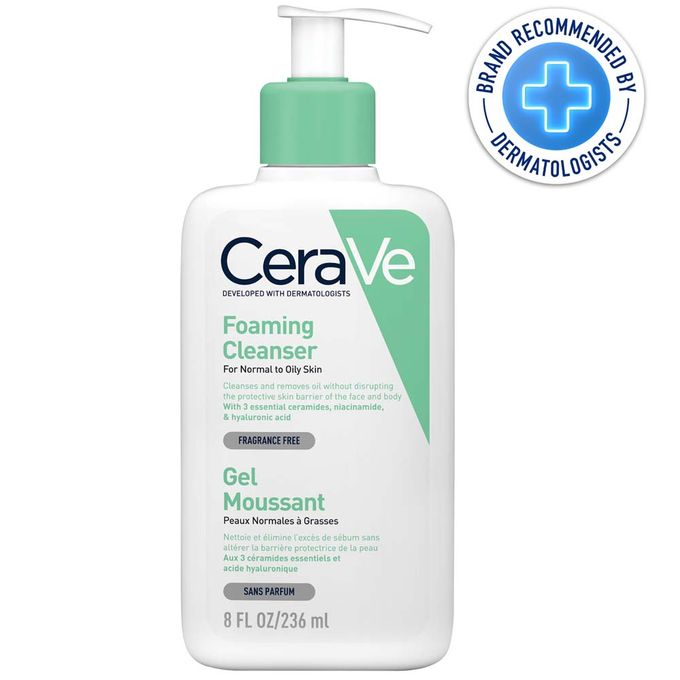 Developed with dermatologists, the foaming gel formula of the CeraVe Foaming Cleanser gently cleanses the skin to remove excess makeup, dirt and oil. It contains 3 essential ceramides to help protect the skin barrier. Hyaluronic Acid helps to retain the skin’s natural moisture while Niacinamide calms the skin.