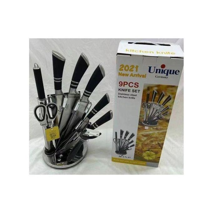 Stainless Steel Kitchen Cutlery Knife Set with Rotating Block Stand. This knife set includes chopping knife, chef knife, slicer etc. The stainless steel kitchen knives are resistant to corrosion, durable in use. These knives will do wonders for your life. Stored on a gorgeous acrylic stand and equipped with ergonomic soft touch handles, this knife sets are a beautiful compliment to any kitchen